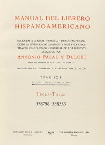 1948-1977. (BIBLIOGRAFIA). PALAU Y DULCET, ANTONIO: MANUAL DEL LIBRERO HISPANO-AMERICANO. Barcelona: Libr. Anticuaria de A. Palau, 1948-1977. 28 vols. en 4º. 500 p. c/u aprox. Enc. en plena piel, nervios y tejuelo. [Más:] ID.: INDICE ALFABETICO DE...
