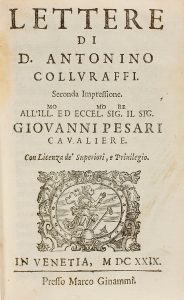 1629. (LITERATURA). COLLURAFFI, ANTONINO: LETTERE. Venetia: presso Marco Ginammi, 1629. 12º. 6 h. + 437 p., 1 h. Enc. en pergamino.