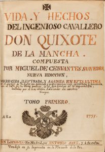1735. (CERVANTINA). CERVANTES SAAVEDRA, MIGUEL DE: VIDA, Y HECHOS DEL INGENIOSO CAVALLERO DON QUIJOTE DE LA MANCHA. Madrid: Imp. Antonio Sanz, 1735. Dos vol. en 8º mayor. I: Portada y portadilla manuscritas, 107 p. + 388 p., 2 h (la última de...