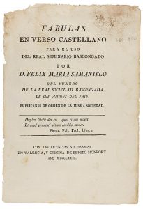 1781. (LITERATURA). SAMANIEGO, FELIX MARIA: FABULAS EN VERSO CASTELLANO PARA EL USO DEL REAL SEMINARIO BASCONGADO. Valencia: Oficina de Benito Monfort, 1781. 4º menor. 10 h. + 207 p. Ejemplar sin enc. Señal de humedad en el margen interno.