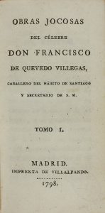 1798. (LITERATURA). QUEVEDO VILLEGAS, FRANCISCO DE: OBRAS DE... Madrid: Imp. Villalpando, 1798. 6 vol. en 12º. I: OBRAS JOCOSAS. VIII p. un retrato grabado por Vicente Albarrazín, 361 p. II: 354 p., con una cabecera grabada. III: Cabecera grabada,...