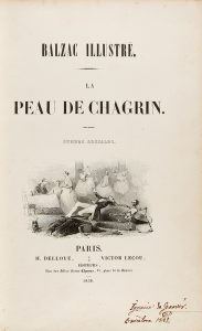 1838. (LITERATURA). BALZAC: LA PEAU DE CHAGRIN. ETUDES SOCIALES. Paris: H. Delloye, Victor Lecou, 1838. 4º. Viñetas grabadas al cobre. 402 p., 1 h. Puntos de óxido. Enc. en media piel.