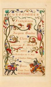 1890 ca. MICHEL, F.: CHRONIQUES FRANÇOISES DE JACQUES CONDAR CLERC. PUBLIES PAR... CUIVIES DE RECHESCHES SU LE STGLE PAR CHARLES NODIER. Paris: Louis Janet, s.a. 8º menor. CLVII fol., 11 p., 44 p., 3 h. Páginas ilustr. al estilo del miniado...