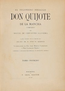 1905. (CERVANTINA). CERVANTES SAAVEDRA, MIGUEL DE: EL INGENIOSO HIDALGO DON QUIJOTE DE LA MANCHA. Barcelona: F. Seix edit., 1905. 2 vols. en 4º menor. I: LXXXVIII p. + 607 p., 9 láms.; II: XXIII p. + 667 p., 4 láms. Ilustrado con láminas...