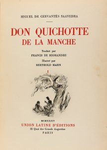 1935. (CERVANTINA). CERVANTES SAAVEDRA, MIGUEL DE: DON QUICHOTTE DE LA MANCHE. Trad. Francis de Miomandre. Paris: Union Latine d´Editions, 1935. 5 vols. en 4º menor. I: XVII + 306 p., 1 h.; II: 326 p., 1 h.; III: 367 p.; IV: 374 p.; V: La vie de...