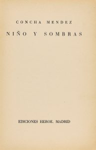 1936. (LITERATURA-PRIMERA EDICION). MENDEZ, CONCHA: NIÑO Y SOMBRAS. Madrid: Talleres de Manuel Altolaguirre y Concha Méndez, Eds. Héroe, 1936. 8º. 40 p., 1 h. Enc. edit. en cartoné, sin el lomo. Ex-libris manuscrito de anterior.