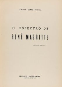 1948. (1a EDICION). GOMEZ-CORREA, ENRIQUE: EL ESPECTRO DE RENE MAGRITTE. Chile: Ediciones Mandragora, 1948. 4º. 20 p. Láminas. Rústica editorial. Ejemplar numerado de una edición limitada a 500, firmado por el autor. Perfecto estado de...
