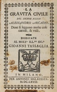 1668. (CIENCIAS). ARCADIO, ALESSANDRO: LA GRAVITA CIVILE. Milano: Antonio Malatesta, 1668. 8º menor. 136 p. Portada en orla xilográfica y con grabado. Cabeceras. Enc. en pergamino de época. Antiguas marcas de tinta en la portada. Pequeña...