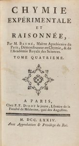 1774. (CIENCIAS). BAUME, M.: CHYMIE ESPERIMENTALE ET RAISONNEE. Paris: P.F. Didot, 1774. 4 vol. en 8º. I: CLXVI, 353 p., 7 láminas plegadas; II: 499 p., 3 láminas grabadas; III: 506 p.; IV: 492 p., 2 láminas plegadas. Enc. en plena piel con...