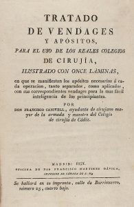 1821. (MEDICINA). CANIVELL, FRANCISCO: TRATADO DE VENDAGES Y APOSITOS PARA EL USO DE LOS REALES COLEGIOS DE CIRUJIA. Madrid: Oficina de Francisco Martinez Dávila, 1821. 8º mayor. 3 h. + 146 p. Ilustr. con 11 lám. plegadas. Enc. en plena piel,...