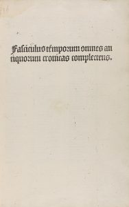 1481. (INCUNABLE-GENEALOGIA). [ROLEWINCK, WERNER:]. FASCICULUS TEMPORUM OMNES ANTIQUORUM CRONICAS COMPLECTENS. [Venetia: Imp. Erhard Ratdolt], 1481. Folio menor. 8 h., 63 fol., 1 h. Ilustr. con xilografías de bella factura en el texto. Primer folio...