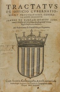 1592. (HISTORIA-ARAGON). BARDAXI, IBANDO: TRACTATUS DE OFFICIO GUBERNATIONIS GENERALIS REGNI ARAGONUM. Caesaraugustae (Zaragoza): apud Laurentium Roblres, 1592. Folio menor. 4 h., 244 p., 12 h. Dos partes juntas y cada una con portada propia y...