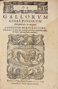 1592. (HISTORIA). MERULA, GAUDENTIO: DE GALLORUM CISALPINORUM ANTIQUITATE, AC ORIGINE. Bergomi: typis Comini Venturae, 1592. 8º menor. 7 h. + 1bl. + 175 p. Viñetas. Antiguo cerco de humedad. Enc. en pergamino.