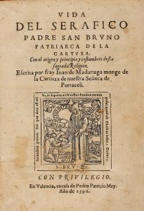1596. (1ª EDICION-CARTUJANOS). MADARIAGA, SAN JUAN DE: VIDA DEL SERAFICO PADRE SAN BRUNO PATRIARCA DE LA CARTUXA: con el origen y principios y costumbres de la Sagrada Religión. Valencia: en casa de Pedro Patricio Mey, 1596. 8º mayor. 20 p. + 197...