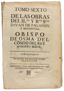 1667. (HISTORIA-FUENTERRABIA). PALAFOX: TOMO SEXTO DE LAS OBRAS DEL ILL. YR. SEÑOR D. IUAN BAPTISTA SERRA. Madrid:Iuan Valdés, 1667. Folio menor. 22 p. + 720 p., 22 p. Enc. en pergamino de época. Frontis y lámina con retrato del autor. Mancha...