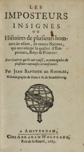 1683. (HISTORIA). ROCOLES, JEAN BAPTISTE DE: LES IMPOSTEURS INSIGNES OU HISTOIRES DE PLUSIEURS HOMMES DE NEANT, DE TOUTES NATIONS... Amsterdam: Imp. Abraham Wolfrang, 1683. 12º. 12 h., 566 p., 1 h. y 16 lám. con grabados. Capitales ilustradas y...