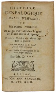 1718. (HISTORIA-GENEALOGIA). HISTOIRE GENEALOGIQUE ROYALE D´ESPAGNE, OU HISTOIRE ABREGEE DE CE QUI S´EST PASSÉ DANS LA GRAN MONARCHIE D´ESPAGNE. Leyde [Leiden]: Chez Joh. ran. Langerak, 1718. 8º menor. 8 h., 403 p., 2 h., [Mas:] DEFENSE DE...