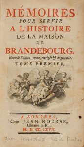 1767. (HISTORIA-BRANDENBURGO). [FEDERICO II:]. MÉMOIRES POUR SERVIR A L´HISTOIRE DE LA MAISON DE BRANDEBOURG. Londres: Chez Jean Nourse, 1767. 8º menor. XXIII + 587 p y 3 lám. plegadas. Dos partes enc. en un vol. en plena piel, ruedas dorados en...