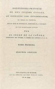 1794. (DERECHO). CAÑADA, CONDE DE LA: INSTITUCIONES PRACTICAS DE LOS JUICIOS CIVILES ASI ORDINARIOS COMO EXTRAORDINARIOS EN TODOS SUS TRAMITES, SEGUN QUE SE EMPIEZA, CONTINUAN, Y ACABAN EN LOS TRIBUNALES. Madrid: Oficina de Don Benito Cano,1794. 2...