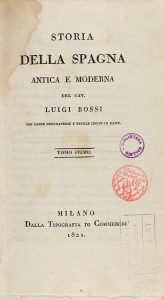 1821-1822. (HISTORIA ESPAÑA). BOSSI, LUIGI: STORIA DELLA SPAGNA ANTICA E MODERNA. Milano: Tip di Commercio, 1821-1822. 8 vol. en 8º. I: XXVI + 339 p., ilustr. con lám. fuera del texto y un mapa plegado de la península. II: 410 p., 1 h. ilustr....