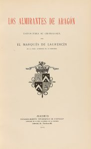 1919. LAURECIN, MARQUES DE: LOS ALMIRANTES DE ARAGON. DATOS PARA SU CRONOLOGIA. Madrid: Est. Tip. de Fortanet, 1919. 4º mayor. 76 p. Abundantes láminas con retratos. Enc. en plena piel. Tejuelo. Sello en seco Saltillo.