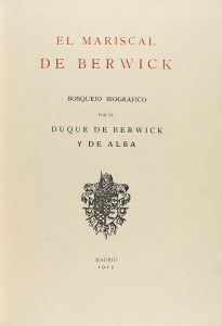 1925. DUQUE BERWICK Y DE ALBA: EL MARISCAL DE BERWICK. Bosquejo biográfico por... Madrid: s.i., 1925. 4º mayor. 538 p. Ilustr. con XXXV láms. Enc. en tela decorada con escudo real en las cubiertas, lomo en piel, algo rozado.