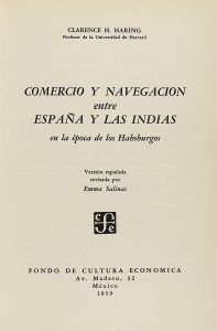 1939. (COMERCIO INDIAS). HARING, CLARENCE H.: COMERCIO Y NAVEGACION ENTRE ESPAÑA Y LAS INDIAS EN LA EPOCA DE LOS HABSBURGOS. México: Fondo de Cultura Económica, 1939. 4º menor. XXVI p. + 460 p. Enc. en media piel con hierros en el lomo. Conserva...
