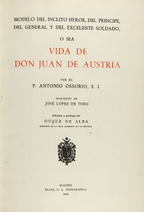 1946. (HISTORIA). OSSORIO, ANTONIO: VIDA DE DON JUAN DE AUSTRIA. Edición y prólogo del Duque de Alba. Madrid: Blass, s.a., 1946. 4º. 335 p. Láminas, una de ellas a color en plena página. Enc. en plena piel con nervios en el lomo y doble...