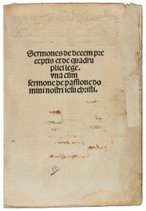 1512. (SERMONES). HIEREMIE, PIETRI: SERMONES DE DECEM PRECEPTIS ET DE QUADRUPLICI LEGE. UNA CUM SERMONE DE PASSIONE DO MINI NOSTRI IESUCHRSITI. Lugdunum (Lyon): Imp. Johanem de Vingles, 1512. 8º. lx + xlviii + xlvi + lxviii + clvii fol.Texto a dos...