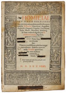 1538. (RELIGION-HOMILIAS). HOMILIAE SEU MAVIS SERMONES SIUE CONCIONES AD POPULUM, PRAESTATISSIMORUM ECCLESIAE DOCTORUM, HIERONYMI, AUGUSTINI, ABROSII, GREGORII... Lugduni [Lyon]: Imp. Mathian Bonhome, 1538. 4º menor. 230 fol. Texto a dos columnas,...