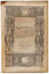 1547. (RELIGION). AQUIN, THOMAE: PRIMA SECUNDAE OPERUM. Lugduni (Lyon): Apud Hugonenm & Haeredes, 1547. Folio. 24 h., 173 fol. Portada a dos tintas con grabado arquitectónico. Texto a dos columnas, con apostillas marginales. Capitales. Enc. en...