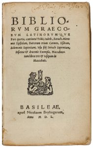 1550. (BIBLIA GRIEGA). BIBLIORUM GRAECORUM LATINORUMQUE. PARS QUARTA. Basileae: Apud Nicalum Brylingerum, 1550. 8º menor. Portada con grabado xilográfico, 567 p. Texto en griego y latín, a dos columnas. Con antiguas anotaciones manuscritas en...