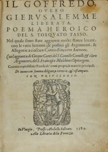 dos columnas. Enc. en pergamino, tejuelo, nervios, cortes pintados. Algún cerco de humedad en las primeras hojas. Bonita edición del poema épico más famoso de este autor, en el que se relata en 20 cantos el sitio de Jerusalem durante la primera cruzada; no sólo pretende defender la fe cristiana sino también combatir la amenaza de la reforma.