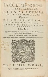 1592. MENOCHII, IACOBI: DE ADIPISCENDA ET RETINENDA POSSESSIONE AMPLISSIMA ET DOCTISSIMA COMMENTARIA. Venetiis: apud Haeredes Ioann. Baptistae Somaschi, 1592. En colofón, 1591 Folio menor. 18 h. + 130 fol. Texto a dos columnas. Portada con grabado...