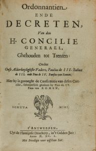 1650. (TEOLOGIA). [TILIUS, THOMAS:]. ORDONNANTIEN ENDE DECRETEN, VAN DEN H. CONCILIE GENERAEL, GHEHOUDEN TOT TRENTEN. Antewerpen [Amberes]: Imp. Plantiinse Druckery, 1650. 8º menor. 16 h., 425 p., 4 h. Enc. en pergamino, lomera rotulada, cortes...