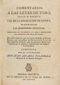 1796. (DERECHO). ALVAREZ POSADILLA, JUAN: COMENTARIOS A LAS LEYES DE TORO, SEGUN SU ESPÍRITU Y EL DE LA LEGISLACION DE ESPAÑA. EN QUE SE TRATAN LAS QÜESTIONES PRACTICAS, ARREGLANDO SUS DECISIONES A LAS LEYES Y RESOLUCIONES MAS MODERNAS QUE EN EL...