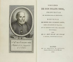 1806. TOMAS, LUCAS DE: VIRTUDES DE SAN FELIPE NERI. Madrid: en la Imprenta de Repullés, 1806. 8º. 16 p. + 144 p. Impreso en grueso papel de hilo, sin defectos y con amplios márgenes. Frontis calcográfico con un retrato del santo. Encuadernado...
