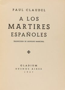 1937. (HUMANIDADES). CLAUDEL, PAUL: A LOS MARTIRES ESPAÑOLES. Trad. Leopoldo Marechal. Buenos Aires: Gladium, 1937. 8º mayor. 29 p., 1 h. Rústica.