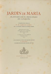 1949. (MONTSERRAT). CAMOS, NARCISO: JARDÍN DE MARÍA PLANTADO EN EL PRINCIPADO DE CATALUNYA. Nota proemial por el reverendo doctor E. Junyent. Barcelona: Ed. Orbis, 1949. 4º mayor. 497 p., 7 h. Ilustr. con grabados en el texto con xilografías a...