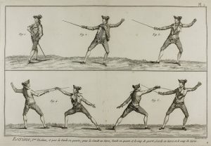 1780 ca. CONJUNTO DE 5 GRABADOS DOBLES DE ESGRIMA PROCEDENTES DE L´ENCICLOPEDIE DES ARTS ET DES METIERS. 24 x 36 cm. plancha; 31 x 46 cm. papel.