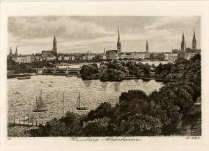1900 ca. (HAMBURGO). HAMBURG ALSTERBASSIN. [Augsburg: von Hauer für die Academie Imperiale], sa. 8x12 cm. plancha; 14x20,5 cm. papel. Buen estado de conservación.
