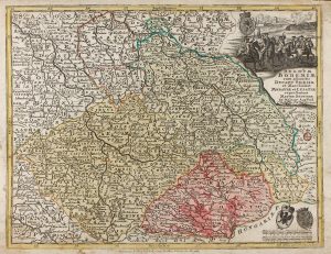 1745 ca. SEUTTER: REGNUM BOHEMIAE EUM ADIUMETIS DUCATU SILESIAE ET MARCHIONAT ... Mapas grabados al cobre y coloreados, 21 x 29 cm. Imagen alegórica militar en la esquina superior derecha.
