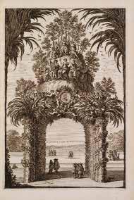 dorés autour des plats, fleur de lys en angle, dos à nerfs orné de même, tranches dorées (reliure de l’époque). Première édition, rare. Une longue tradition en France : les entrées solennelles inspirées des triomphes romains. Après la proclamation de la paix et le mariage royal, Louis XIV et Mazarin voulurent sceller, avec un éclat particulier, la fin de la Fronde et l’alliance avec l’Espagne. Louis XIV entra à Paris le 16 août 1660 pour y recevoir l’ovation de ses sujets, au cours d’une cérémonie orchestrée par le prévôt des Marchands et des Échevins. On fit appel aux architectes et aux artistes pour transformer l’itinéraire du roi en une succession d’arcs de triomphe et de monuments à sa gloire : place du Trône, un dais monumental ; faubourg Saint-Antoine, un arc de triomphe ; place Baudoyer, une porte en forme de mont Parnasse... Charles Le Brun avait été chargé de métamorphoser la place Dauphine en un amphithéâtre « à l’antique » et de l’orner d’un obélisque. Tout est symbole dans ces constructions éphémères et tout y est luxe. L’exécution fut confiée aux plus habiles peintres, doreurs, brodeurs, menuisiers, charpentiers… du début du règne. Le cortège, tout aussi spectaculaire, composé selon un protocole étudié, était formé de tous les corps de l’État, en costumes chamarrés d’or, d’argent, de broderies et de pierreries... Un frontispice signé François Chauveau (1613-1676), un portrait de Louis XIV resté anonyme, un feuillet de dédicace gravé, et 22 planches dont 12 portent la signature de Jean Marot (ca). Exemplaire de qualité. Relié à l’époque en maroquin rouge, condition rare, il a été décoré d’une fleur de lys plusieurs fois répétée. Coiffes supérieure et inférieure, et coins anciennement restaurés. Dimensions : 436 x 290 mm. Provenances : ex-libris manuscrit de l’époque « F. Contenot » ; Gourary (Cat., 2009, n° 354). Vinet, 501 (un portrait et 19 pl.) ; Ruggieri, 494 ; Millard, I, 159 ; Cicognara, 1459 ; Brunet, II, 1004 (un portrait et 18 pl.) ; […], Chroniques de l’éphémère, le Livre de fête dans la collection Jacques Doucet, INHA, n° 4 (ex. aux armes de la marquise de Pompadour).