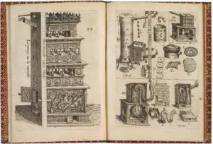 matières nourrissantes le feu, & neantmoins entretenir es poiles une chaleur commode, & plus salubre, escrite premierement en Allemand, pour le bien & le profit de l’Allemagne, & declaré par Figures representantes les dits fourneaux. Maintenant publiee en François pour le bien & le profit public de la France, & de tous ceux qui usent de cette langue. Oppenheim, Jean Théodore de Bry, 1619, in-4°, maroquin rouge, triple filet doré autour des plats, dos lisse orné, coupes filetées or, roulette intérieure dorée, doublure et gardes de soie bleue, tranches dorées (reliure du xviiie siècle). Première et unique (?) édition française. Elle a été publiée par le graveur sur cuivre et éditeur Jean Théodore de Bry (1561-1623), né à Strasbourg, qui s’établit à Oppenheim, en 1609. Le livre a paru l’année précédente en allemand, chez le même éditeur, sous le titre Holzsparkunst. Premier livre sur le chauffage individuel au moyen de poêles. Peintre de Francfort, Franz Keslar ou Kessler (ca 1580-ca 1630) décrit plusieurs modèles de chauffage alors inédits en France. “In 1619, Franz Keslar, a painter from Frankfurt-am-Main, published at Oppenheim, in french, his Espargne-bois (‘Wood- saver’), in which he set out merits of what was, in France, still an invention for the future. It was a way to keep warm in cold weather while economising on wood, and so to bring relief to the poor and the mass of the people. In France, following Germany, the public good was involted in this new still at guiding fire and capturing heat, getting rid of smoke through pipes made of earthenware or metal, and warming rooms both large and small. The model advocated by Keslar was a wood-burning furnace such as is still used today, several tiers high and «magnificently» decored, probably to make up for the loss of decoration due to the disappearance of the fireplace.” 5 planches gravées sur cuivre, dont une dépliante. Intéressante illustration figurant les divers types de poêles, dont deux sont des chauffages individuels richement décorés, à la manière des kachelofen [poêles à carreaux] alsaciens. Reliure en maroquin, de la seconde moitié du XVIIIe siècle, faite avec soin, dans la lignée de celles élégamment exécutées par Derome pour le duc de La Vallière. Feuillets brunis comme très souvent. Dimensions : 196 x 142 mm. Provenance : Yemeniz (Cat., 1867, n° 894 (« Livre extrêmement curieux et pour le texte et pour les figures dont il est enrichi et qui représentent des systèmes de chauffage, dont quelques-uns, malgré les progrès de ces derniers temps, ne seraient pas à dédaigner »)), avec son ex-libris. Roche (D.), A History of Everyday Things, the Birth of Consumption in France,, p. 128.