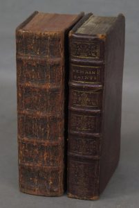 dorés à la roulette, armes dorées au centre, dos à nerfs orné de motifs et fleurs de lys dorés, tranches dorées sur marbrures, [Rel. de l'époque]. Exemplaire correct avec les armes de France dorées au centre des plats (celles du plat supérieur en parties effacées). Quelques traits de crayon.— JOINT : • SCHAITBERGER (Joseph). NEU-VERMEHRTER EVANGELISCHER SEND-BRIEF. Nuremberg, Joh. Andrea Endter, [vers 1733] ; fort vol. in-12, basane ocre, encadrement de motifs à froid sur les plats avec fleurons à froid aux angles, dos à nerfs orné de motifs à froid, traces de fermoirs, [Rel. de l'époque]. Quelques rousseurs ; notes manuscrites anciennes sur les premières gardes blanches.