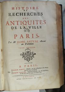 l'époque], coiffes et coins restaurés. 1) [3] ff., 1 1 , 672 p.- 2) [1] f., 8, 759 p.- 3) 4, 652, 89 p., [1] f. Édition originale de cet ouvrage posthume, publié grâce au concours de l'ami et collaborateur de l'auteur, Claude Bernard Rousseau. Henri Sauval (1623-1676) passa la plus grande partie de sa vie à recueillir des matériaux dans les archives de la ville de Paris. Provient de la bibliothèque du gentilhomme des lumières Pierre-Marie-Christophe Bollioud de Brogieux (1735- 1826), avec son cachet. Mouillure marginale et infimes défauts à certains feuillets.