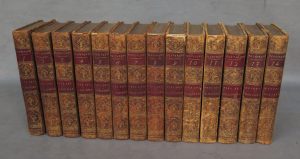 plats, dos longs ornés de motifs dorés, pièces de titre et de tomaison rouges, tranches dorées, [Rel. de l'époque]. ORNÉ DE 21 (SUR 22) FIGURES GRAVÉES SUR CUIVRE HORS TEXTE .Ensemble complet des 14 volumes des Vies des hommes illustres, avec les deux premiers volumes (sur 4) des Œuvres morales de Plutarque, en belle reliure uniforme de l'époque. Infimes et rares rousseurs, mors un peu frottés, accrocs à quatre coiffes ; les p. 93-126 du tome IX et 403-416 du tome XIV sont manquante. Cohen, 810.