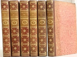 Regnard (Jean François). Œuvres. Avec des avertissements et des remarques sur chaque pièce. Paris, Ve Duchesne, 1789-1790 ; 6 vol. in-8, demi-maroquin marron, pièces de titre et de tomaison fauves, dos à nerfs orné de motifs dorés, [Rel. de...