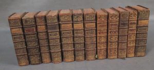 pièces de titre et de tomaison rouges, [Rel. de l'époque], un peu frottée. Ouvrage orné de 6 FIGURES, CARTES ET PLANS GRAVÉS SUR CUIVRE HORS TEXTE ET REPLIÉS . Manque le tome 12. Les huit premiers volumes sont en reliure uniforme, les trois suivants en basane décorée dans le même esprit, le dernier en veau, avec des motifs encore différents. Une figure légèrement atteinte par le ciseau du relieur. Mouillure marginale claire àunvol., sinon bon exemplaire, bien complet des figures. Brunet, IV, 1360. Quérard, VIII, 128.