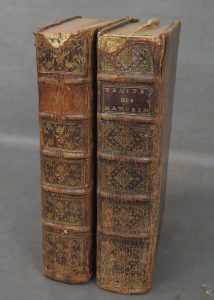 ; fort vol. pet. in-4, basane brun, dos à nerfs orné de motifs dorés, pièce de titre vieux rouge, [Rel. de l'époque]. La deuxième partie du livre (quatrième partie de l'ouvrage) commence par un commentaire de 63 pages sur les duels (Édit du Roy du mois de Juin 1643). Reliure frottée, cahiers partiellement déboîtés.— JOINT : • ROUSSEAUD DE LA COMBE (Guy). RECUEIL DE JURISPRUDENCE CIVILE dupays dedroit écrit etcoutumier, par ordre alphabétique. Paris, Paulus-du-Mesnil, 1753 ; fort vol. pet. in-4, veau marbré, dos à nerfs orné de motifs dorés, [Rel. de l'époque]. Annotations marginales anciennes. Reliure frottée mais solide ; bon exemplaire par ailleurs.
